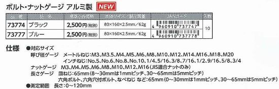 2026年1月23日 / 最終更新日時 : 2026年1月23日 山田恵美 新製品 ボルト・ナットゲージ アルミ製 [シンワ測定株式会社] ボルト・ナットゲージ アルミ製 品番 品名 本体サイズ/製品質量 73774 ブラック 80x160x2.5mm/62g 73777 ブルー 80x160x2.5mm/62g